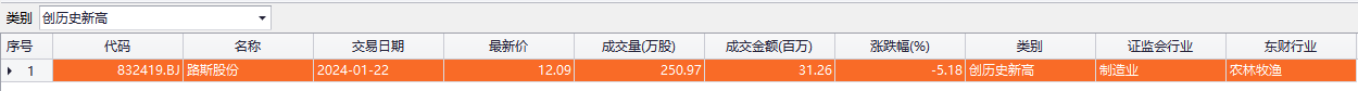 上证报中国证券网讯 Choice数据统计,1月22日共1只个股股价创历史新高,为路斯股份。