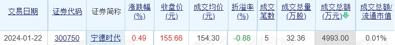 宁德时代昨日大宗交易成交32.36万股 成交额4993万元