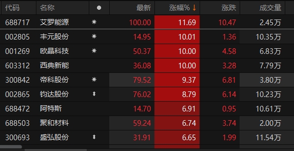 上证报中国证券网讯 1月23日早盘,申万一级行业板块中,电力设备板块继续走强。截至10时04分,艾罗能源涨超11%,帝科股份涨逾9%,钧达股份涨超8%,阿特斯、聚和材料等跟涨。此前,丰元股份、欧晶科技、西典新能涨停。