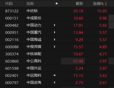 上证报中国证券网讯 1月24日上午交易时段,A股中字头板块盘中异动。10时34分,中成股份拉升涨停,中纺标涨近16%,中国动力、中国重汽、中国海诚等纷纷跟涨。