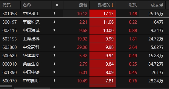 上证报中国证券网讯 1月24日午后,截至14时48分,申万一级建筑装饰板块涨超4%。中粮科工涨超17%。