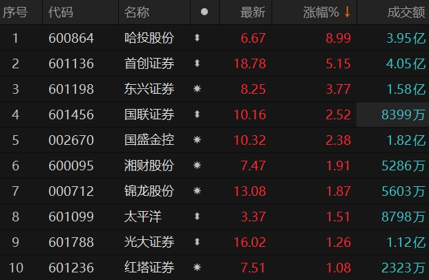 上证报中国证券网讯 1月30日,券商板块表现活跃,截至9时37分,哈投股份涨近9%,首创证券、东兴证券、国联证券等跟涨。