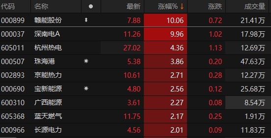 A股公用事业板块震荡上行 赣能股份、深南电A涨停