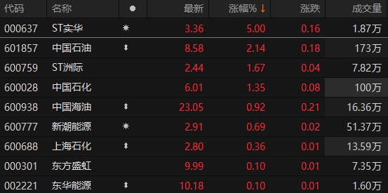 上证报中国证券网讯 1月30日早盘,申万一级行业板块中,石油石化板块异动拉升。截至10时50分,ST实华涨停。中国石油涨超2%,ST洲际、中国石化等跟涨。