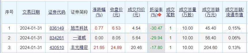 成交价方面,道通科技、ST实达、立讯精密溢价率居前,溢价率依次为5.7%、5.35%、5.3%;旭杰科技、一诺威、丰光精密折价率居前,折价率依次为30.47%、29.94%、17.8%。
