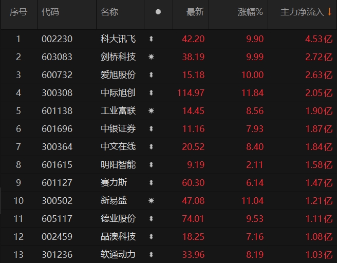 科大讯飞主力资金净流入超4亿元