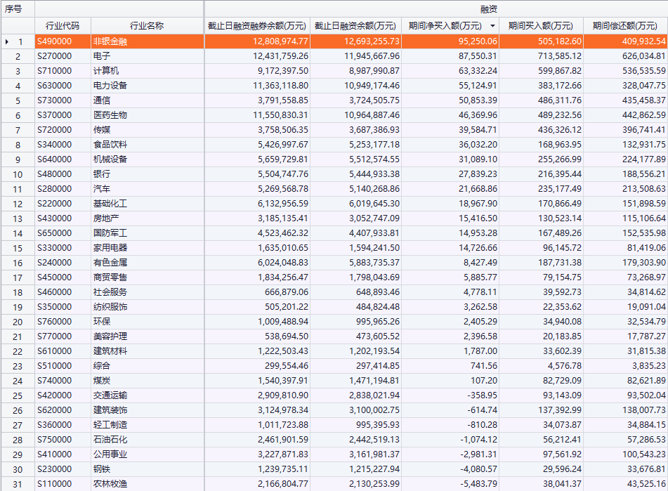 上证报中国证券网讯 据Choice数据统计,昨日沪深两市融资余额13956.48亿元,相比前一日净买入60.47亿元。24大行业获融资资金净买入,7行业净流出;非银金融净买入金额居首,为9.53亿元,电子净买入8.76亿元,计算机净买入6.33亿元;农林牧渔净流出居首,为0.55亿元,钢铁净流出0.41亿元。