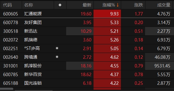 A股商贸零售板块异动拉升 汇通能源接近涨停