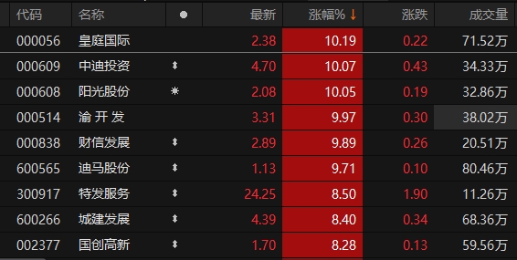 上证报中国证券网讯 2月21日午后,申万一级行业板块中,房地产板块午后涨幅扩大,截至13时31分,房地产板块涨超4%。皇庭国际、中迪投资、阳光股份、渝开发、财信发展涨停。