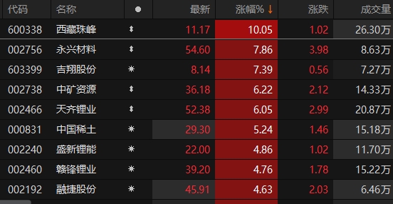 上证报中国证券网讯 2月28日早盘,申万一级行业板块中,有色金属板块异动拉升。截至9时58分,西藏珠峰涨停。永兴材料、吉翔股份涨超7%,中矿资源、天齐锂业涨逾6%,中国稀土、盛新锂能等跟涨。