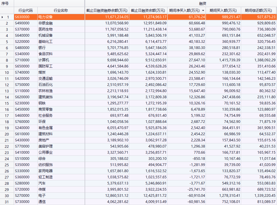 上证报中国证券网讯 Choice数据统计,昨日沪深两市融资余额14344.85亿元,相比前一日净买入31.17亿元。23大行业获融资资金净买入,8行业净流出;电力设备净买入金额居首,为6.14亿元,非银金融净买入6.07亿元,医药生物净买入5.37亿元;通信净流出居首,为6.1亿元,电子净流出6.09亿元,传媒净流出2.57亿元。