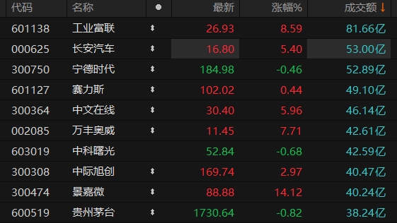 上证报中国证券网讯 3月13日14时01分,工业富联成交额突破80亿元,股价上涨8.59%。此外,长安汽车、宁德时代的成交额居前。