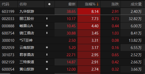 A股社会服务板块异动拉升 九华旅游涨超8%