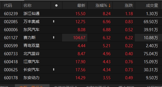 汽车板块开盘拉升 浙江仙通涨超8%