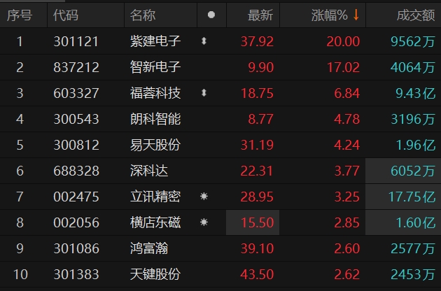 上证报中国证券网讯 3月19日,消费电子板块拉升,截至9时49分,紫建电子涨停,智新电子涨超17%,朗科智能、深科达、立讯精密、天键股份等跟涨。