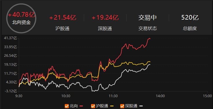 上证报中国证券网讯 3月20日13时47分,北向资金净买入超40亿元,达到40.78亿元。