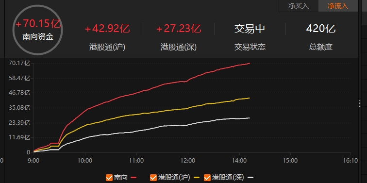 南向资金净流入超70亿港元