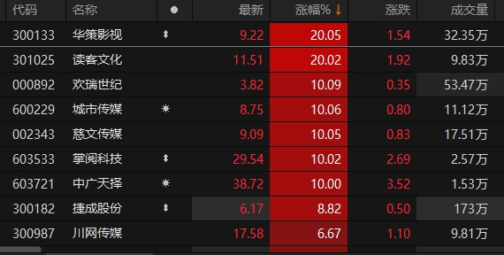 上证报中国证券网讯 3月21日早盘,申万一级行业板块中,传媒板块表现活跃。截至9时47分,华策影视、读客文化、欢瑞世纪、城市传媒、慈文传媒、掌阅科技、中广天择涨停。捷成股份涨逾8%,川网传媒涨超6%。