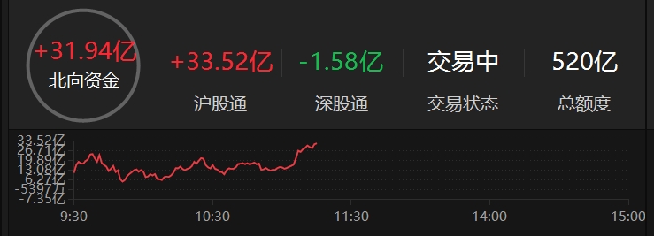 上证报中国证券网讯 截至3月25日11时16分,北向资金净流入超30亿元,达到31.94亿元。
