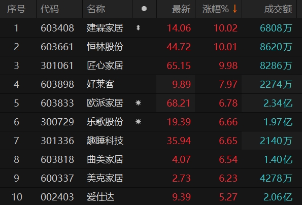 上证报中国证券网讯 4月1日,家居板块走强,截至13时23分,恒林股份、建霖家居涨停,匠心家居涨超10%,欧派家居、乐歌股份、美克家居等多股涨超5%。