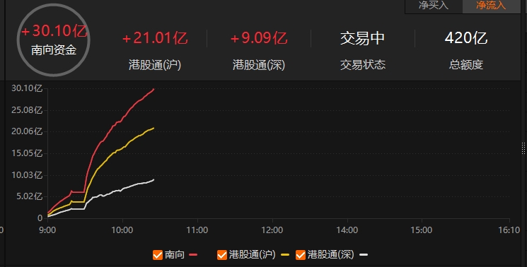 上证报中国证券网讯 4月3日10时25分,南向资金净流入超30亿港元,达到30.1亿港元。