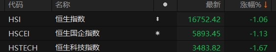 港股恒生指数及恒生科技指数均跌超1%