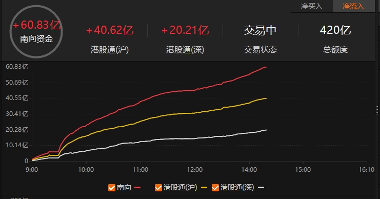 上证报中国证券网讯 4月3日14时19分,南向资金净流入超60亿港元,达到60.83亿港元。