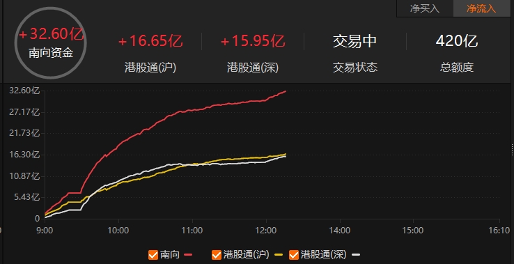 上证报中国证券网讯 截至4月9日13时17分,南向资金净流入超30亿港元,达到32.60亿港元。