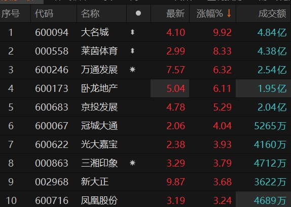 上证报中国证券网讯 4月9日,房地产板块震荡走高,截至13时55分,大名城涨停,卧龙地产、京投发展等跟涨。