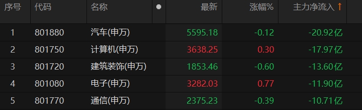 5大板块主力资金净流出超10亿元,其中,汽车板块净流出超20亿元居首,达到20.92亿元。
