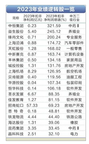 养殖业、中药、房地产开发行业均有2股业绩大逆转,分别为圣农发展、益生股份、昆药集团、中恒集团、招商蛇口、城投控股。