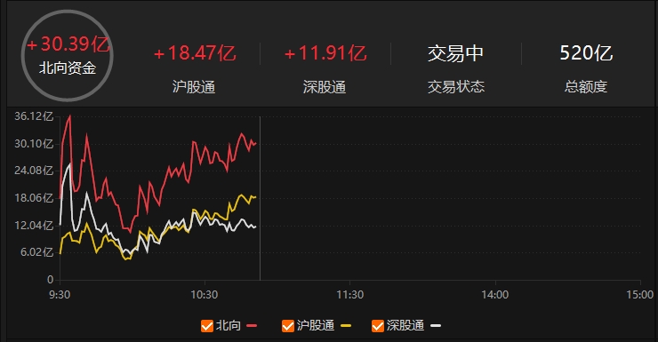 上证报中国证券网讯 截至4月11日10时52分,北向资金净流入超30亿元,达到30.39亿元。