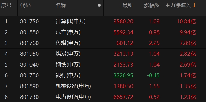 计算机板块主力资金净流入超10亿元居首