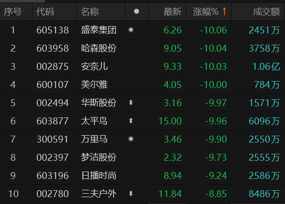 上证报中国证券网讯 4月16日,服装家纺板块走低,截至10时04分,盛泰集团、哈森股份、安奈儿、美尔雅、华斯股份、太平鸟等多股跌停,三夫户外、万里马等跟跌。