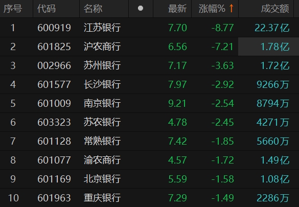 上证报中国证券网讯 4月26日,银行板块震荡下挫,截至9时51分,江苏银行跌近9%,沪农商行跌超7%,苏州银行、长沙银行、南京银行等跌超2%。