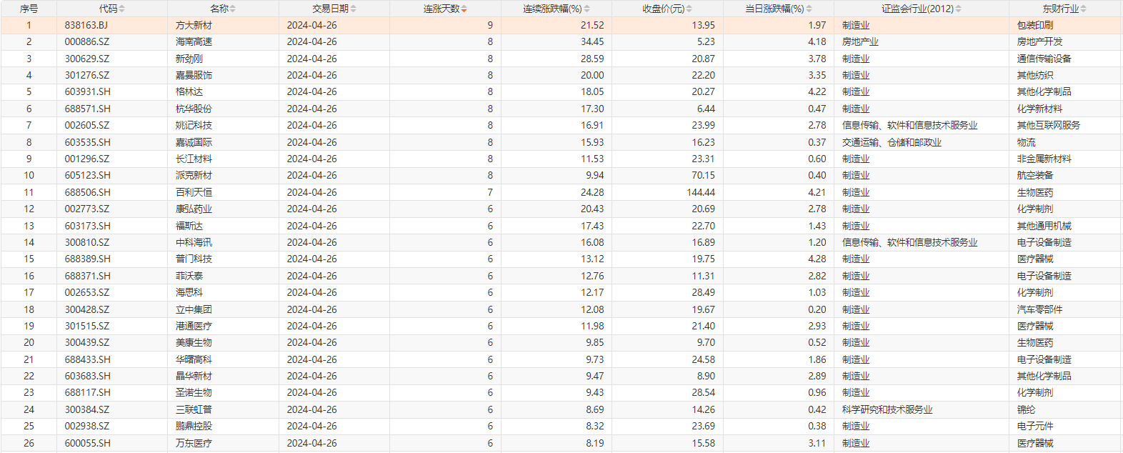 上证报中国证券网讯 Choice数据统计,今日1只个股连续9天上涨,为方大新材;9只个股连续8天上涨,包括海南高速、新劲刚、姚记科技等;此外,百利天恒连续7天上涨;康弘药业、海思科、登海种业等27只个股连续6天上涨。