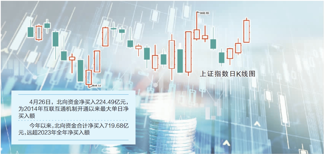 4月26日,北向资金大举加仓A股,开盘后仅半个小时,其净买入额便超过45亿元。截至收盘,全天单边净买入224.49亿元,为2014年互联互通机制开通以来最大单日净买入额。其中,沪股通净买入113.23亿元,深股通净买入111.26亿元。今年以来,北向资金已合计净买入A股719.68亿元,远超2023年全年净买入额。