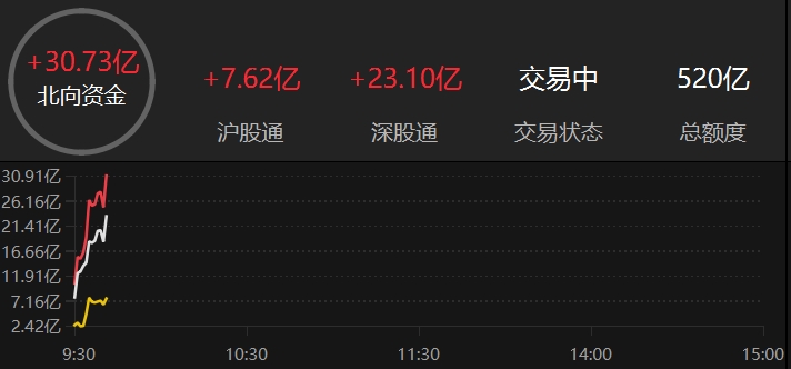 上证报中国证券网讯 4月29日9时42分,北向资金净流入超30亿元,达到30.73亿元。