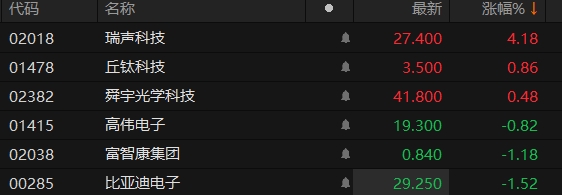 上证报中国证券网讯 5月8日上午交易时段,港股苹果概念股走势分化。10时01分,瑞声科技涨超4%,而富智康集团、比亚迪电子跌超1%。