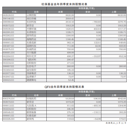具体来看,以生物制药、健康产业为主营业务的长春高新,同时获得多只社保基金加仓。其中,社保基金106组合在去年四季度增持了62万股长春高新,114组合增持了38万股长春高新。而101组合成为新进股东,且位居第四大流通股股东。唯有118组合小幅减持了3万股,但依然位居第三大流通股股东。此外,在前述出现社保身影的20家上市公司中,还有不少都是医药企业,括东诚药业、恩华药业、海翔药业等。