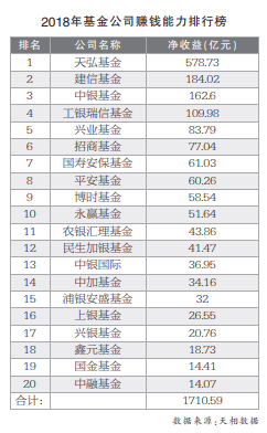 利润超过100亿元的公司锐减至4家,除了凭借天弘余额宝稳居榜首的天弘基金实现收益578亿元、位居首位,排名其后的建信基金、中银基金和工银瑞信基金均是银行系基金公司,分别实现利润184亿元、162亿元和109亿元。不仅如此,在榜单前20名中,银行系基金公司占了一半以上,与之相对应的是多家权益投资比重较大的基金公司排名垫底。