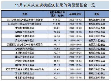 统计显示,11月以来,有3只发行规模在80亿元以上的偏股型基金成立,分别是由萧楠掌舵的易方达高质量严选、杨瑨担纲的汇添富数字生活六个月持有和刘博管理的富国均衡策略。此外,还有12只基金发行规模在50亿元以上,包括嘉实动力先锋、工银优质成长、华安新兴消费、招商景气优选、南方产业升级、汇添富高质量成长精选和嘉实优质精选等。