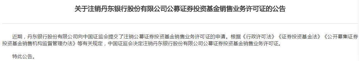 无独有偶,11月24日,辽宁证监局也公告称,近期,丹东银行股份有限公司向中国证监会提交了注销公募证券投资基金销售业务许可证的申请。根据《行政许可法》《证券投资基金法》《公开募集证券投资基金销售机构监督管理办法》等有关规定,中国证监会决定注销丹东银行股份有限公司公募证券投资基金销售业务许可证。