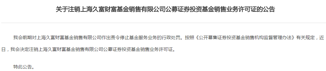 12月1日,中国证监会上海监管局发布公告称,对上海久富财富基金销售有限公司作出责令停止基金服务业务的行政处罚,并注销该公司公募证券投资基金销售业务许可证。