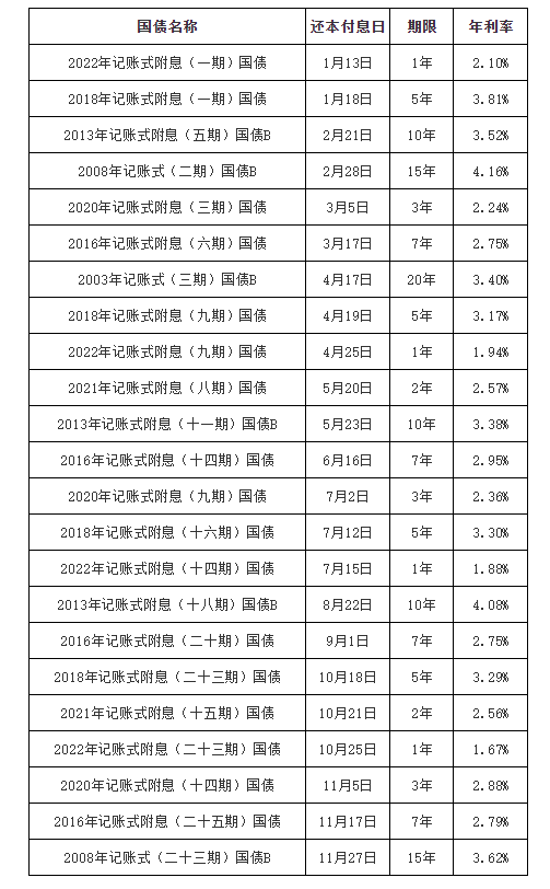 (一)以下记账式附息国债于还本付息日(节假日顺延)归还本金并支付最后一次利息。