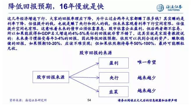 但经历了2015年的股灾,市场普遍不太相信P/E还有大幅攀升的可能。在这样的前提下,P也就是股价要上涨,就只能靠E也就是盈利的上升,但经济不景气下总体盈利不可能有大涨,所以就导致估值最终可能只是小幅上涨,也就是慢牛。