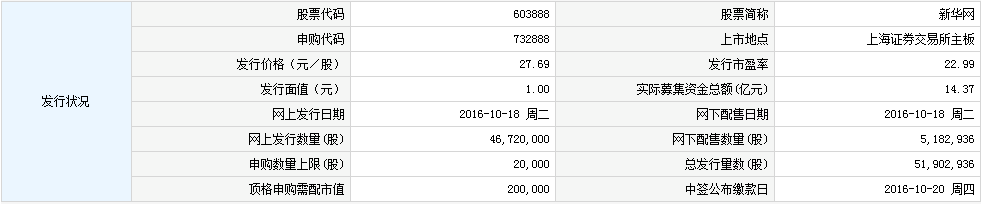 中国证券网讯 据上交所网站26日消息,新华网股份有限公司股票将于2016年10月28日在上海证券交易所上市。股票简称“新华网”,股票代码“603888”,发行价格为27.69 元/股,本次发行的股票数量5,190.2936万股,发行后的总股本20,761.1744万股。