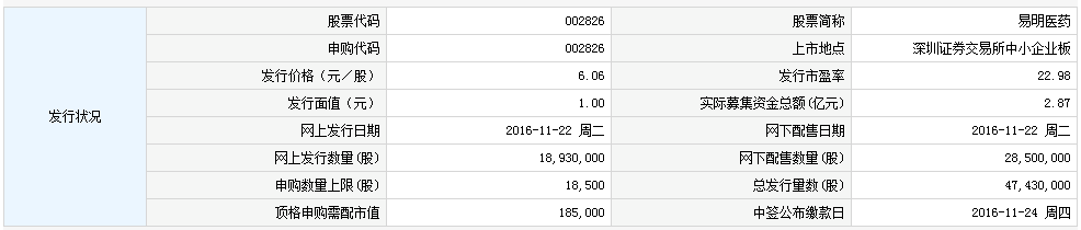 易明医药11月22日发行 申购上限1.85万股