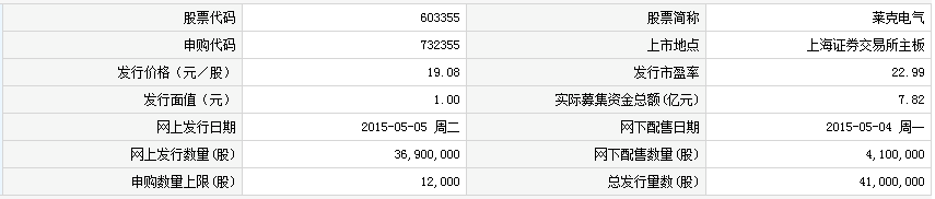 莱克电气股份有限公司人民币普通股股票将于2015年5月13日在上交所上市。