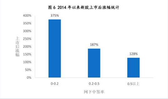 统计显示,2014 年以来新股上市后表现与新股网下中签率存在明显的负相关关系。统计显示,2014年以来的新股中,网下中签率在 0.2%以下的上市后表现最优,平均涨幅达375%。